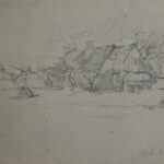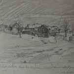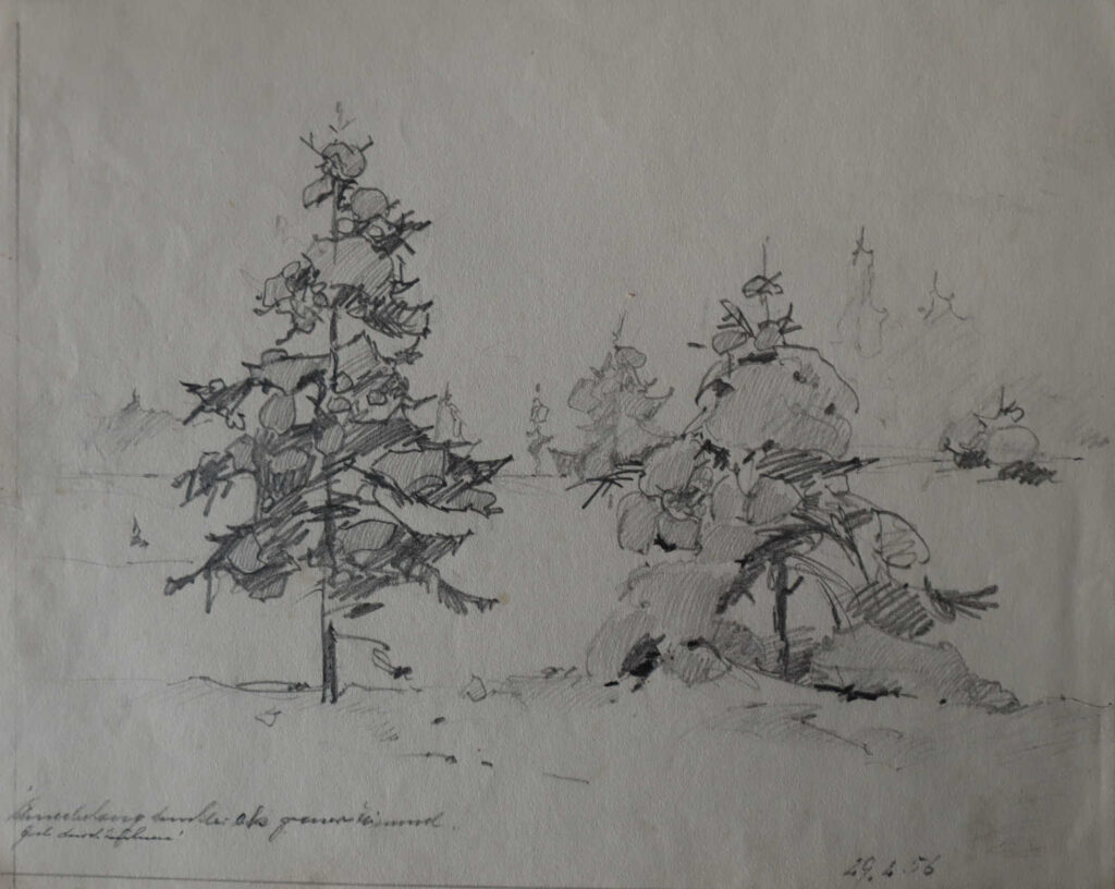 Vogtland, am unteren Rand links Notiz zur Farbgebung eines späteren Aquarells („Schneebehang dunkler als grauer Himmel. Gut durchzeichnen!“)