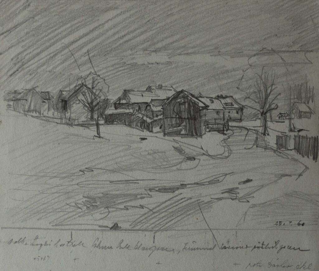 Vogtland, Oelsnitz, Raasdorf, Blick ins Dorf von der Oberen Mühle aus, siehe auch Lfd. Nr. 518, die drei Jahre später entstanden ist, am unteren Rand Notizen zur Farbgebung eines späteren Aquarells („Wolke [?] hell, Schnee hell blaugrau, Himmel wärmer rötlich grau, rote Dächer dkl“), darunter weitere Maße notiert und Skizze einer weiblichen Figur