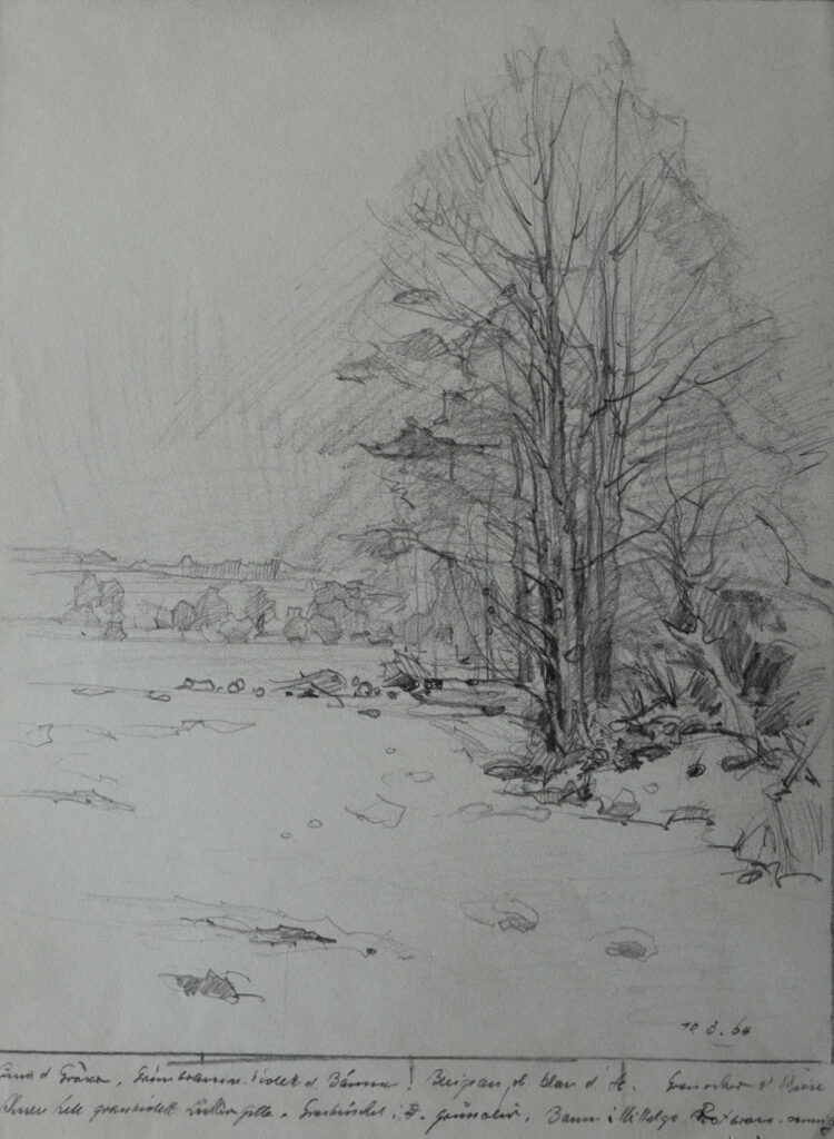 Vogtland, Aquarellversion bekannt, siehe Lfd. Nr. 219, am unteren Rand Notiz zur Farbgebung des späteren Aquarells („Siena d. Gräser, Grünbraun u. violett die Bäume, Bleigrau ob. blau d. H.[immel], Grauocker d. Wiese, Schnee hell grauviolett, [?] gelb, Grasbüschel i. V.[ordergrund] grünoliv, Baum i. Mittelgr. Rotbraun-sonnig“)