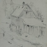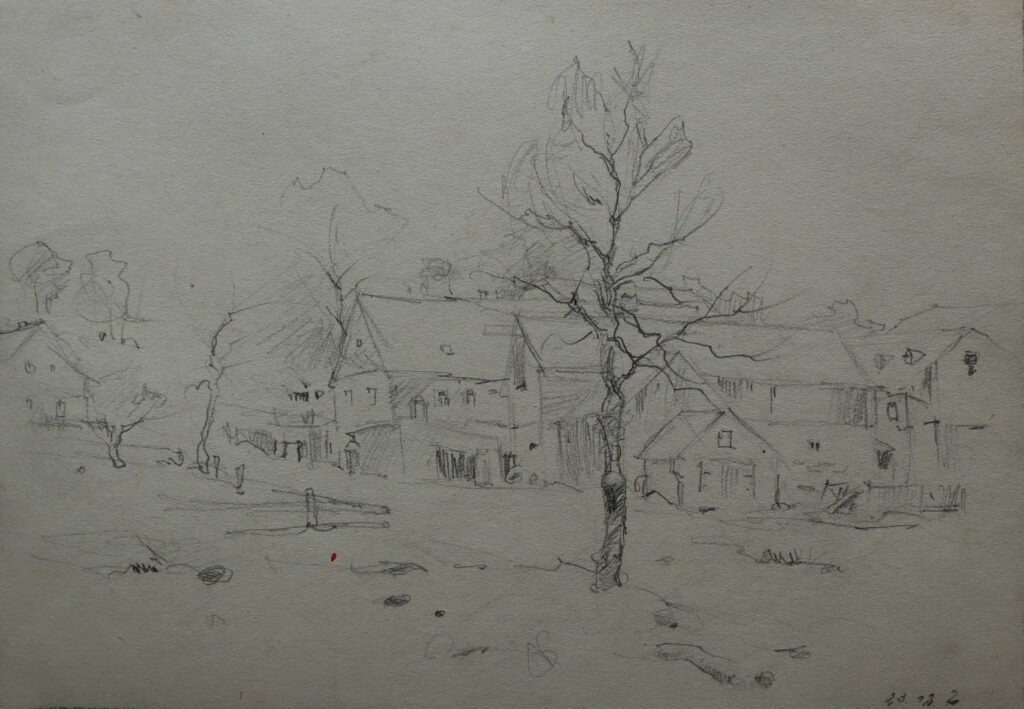 Vogtland, Mühlental, Zaulsdorf, Ortsmitte, am linken Bildrand ein Haus des kleinen Gehöfts, das Schneider öfter porträtierte, siehe Lfd. Nr. 408, (Abriss im Frühjahr 2025)