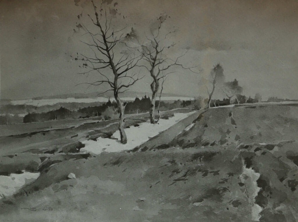 l. u. sig. u. dat. in Blei („MS, 49“), verso auf sw Foto bez. „Letzter Schnee“, Straße Raasdorf-Arnoldsgrün mit Eimberg im Hintergrund