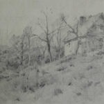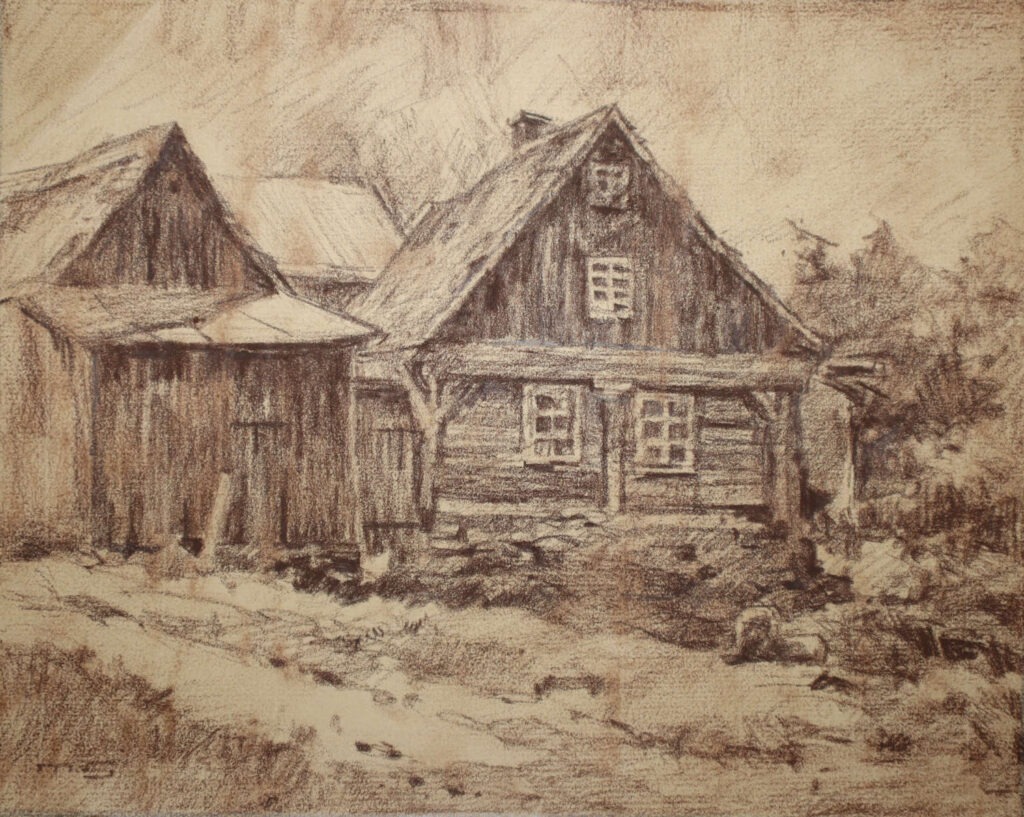 Vogtland, Schöneck, Arnoldsgrün, Elternhaus des 1927 in Arnoldsgrün geb. Kunsthistorikers Friedbert Ficker, ungefähr dat. nach Arbeit in vergleichbarer Technik, bez. nach Holzschnitt seines Elternhauses von Friedbert Ficker aus dem Jahr 1950, abgedruckt in Freie Presse vom 24.10.1991, das Haus befand sich in der Schulstraße und wurde bereits zu Beginn der 1960er Jahre abgerissen, große Aquarellversion bekannt, siehe Lfd. Nr. 128