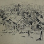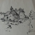 Vogtland, Schöneck, Arnoldsgrün, Slg. Friedbert Ficker Nr. 692, Blick auf die Dorfmitte mit Kirche und ehem. Kindergarten im Vordergrund, auch Tuschezeichnung bekannt, siehe Lfd. Nr. 543, nach dieser dat.